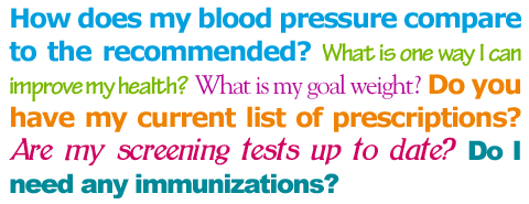 recommended? What is one way I can improve my health? Can you describe my current health status? Are my screening tests up to date? Am I taking the lowest cost prescription drug available?